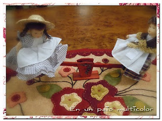 La composición del centro de mesa, los colores del fieltro, y las muñecas antiguas parecen remontarnos a una época pasada…no os parece?